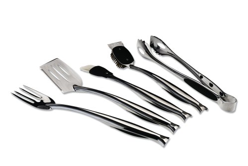 - Includes spatula, fork, tongs, basting brush and head, and grill brush and head