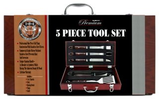02257STAM Features: -5 Piece stamina handle forged tool set. -Set includes spatula, fork, tongs, basting brush and knife. -Construction material: stainless steel. -Hard wood carrying case. -Lifetime warranty.