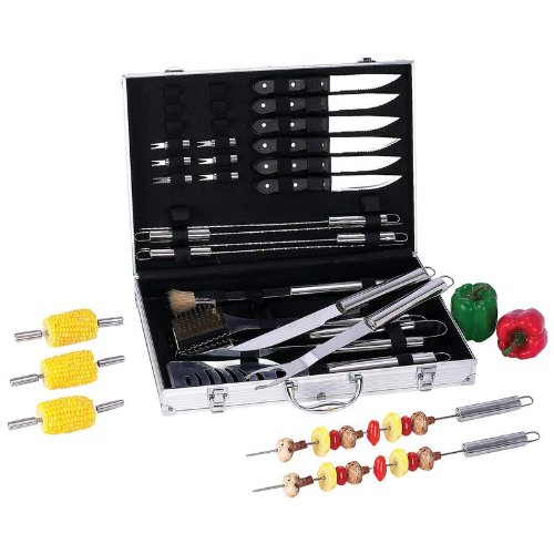 Includes spatula tongs fork knife grill brush basting brush 6 skewers 12 corncob holders and 6 steak knives. All e stored in a 18-3/4" x 12-3/4" x 3-3/8" aluminum carrying case. Limited lifetime warranty. 9.29 Open Stock Value. Gift boxed.