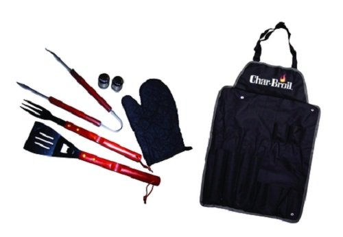 The Char Broil Apron Tool Set is a great all-in-one starter kit for whoever likes to grill. It features stainless steel tools with wood handles, a branded aprong with toll holders, glove, and salt and pepper shakers. The tools include a sptaula, tongs, and fork.