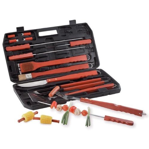 What sets this Chefmaster 19pc Barbeque Set apart from other sets are all the unique pieces including 8 corn cob holders 4 skewers grill cleaning brush/scraper basting brush fork with 3 prongs spatula with builtin bottle opener knife and tongs. The beautiful wood grain on the handles and handy hangup feature are an added plus. All pieces fit in the special handled carrying case so you can take them with you on camping trips or to the park. Measures 23 inch x 12 inch x 3 inch. Five year warranty. Gift boxed 8 lbs. 79. 95 Open Stock Value. 3600PT 51. 95 Item KTBQ19