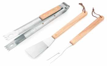You'll become a grill master with these KitchenWorthy 3-piece bbq tools. The speciality tools feature sturdy steel and wood construction. Manufacturer: KitchenWorthy. Retail Packaged: Color gift box. UPC Coded: Yes. Materials: Stainless steel and wood. Dimensions: 14.5 inches L (tongs), 15 inches L (flipper), 15 inches L (fork). How packaged: 1 bbq tool sets per box. Features include: Sturdy, stainless steel construction. Double-riveted hardwood handles. Leather hanging straps.